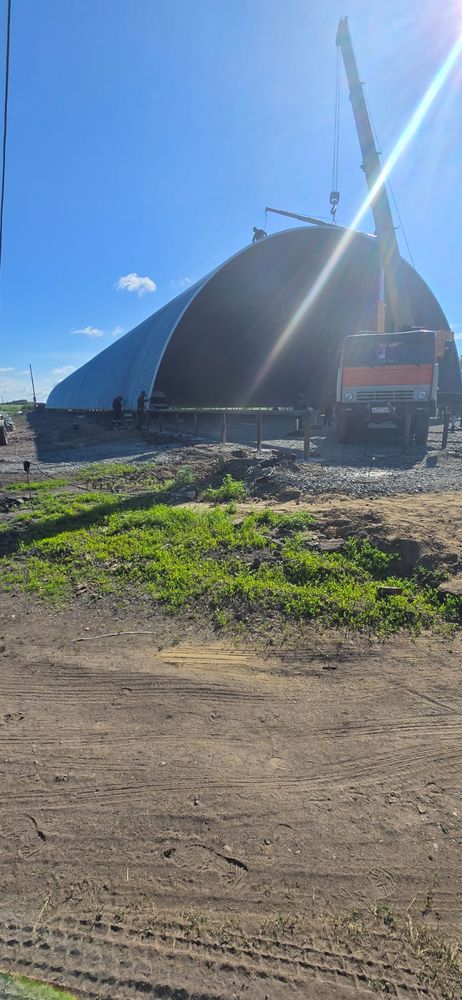На фермерских базах идёт строительство необычных сооружений. Новые объекты настолько масштабные, что никакая фура довезти их до места не сможет. Поэтому металл гнут на месте с помощью специальной техники.